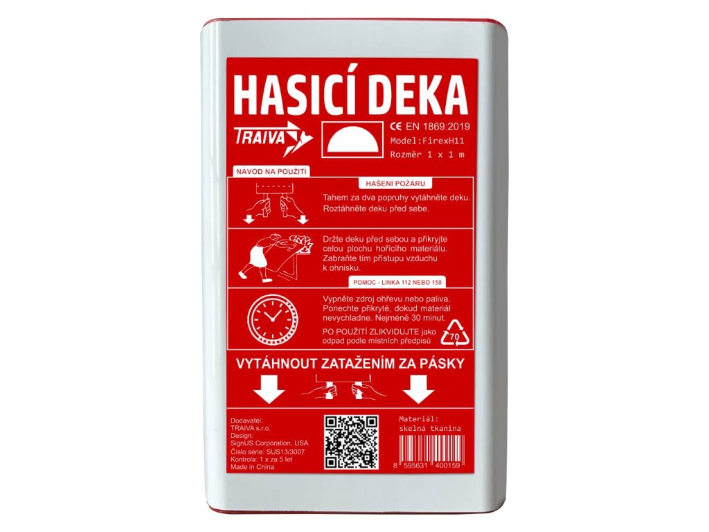 Deka je dodávána v obalu z tvrzeného plastu, který poskytuje lepší ochranu před UV zářením a zajišťuje tím delší životnost produktu ve srovnání s běžnými hasicími dekami.