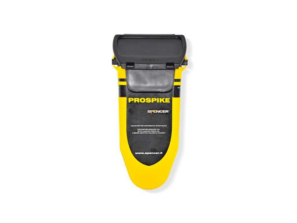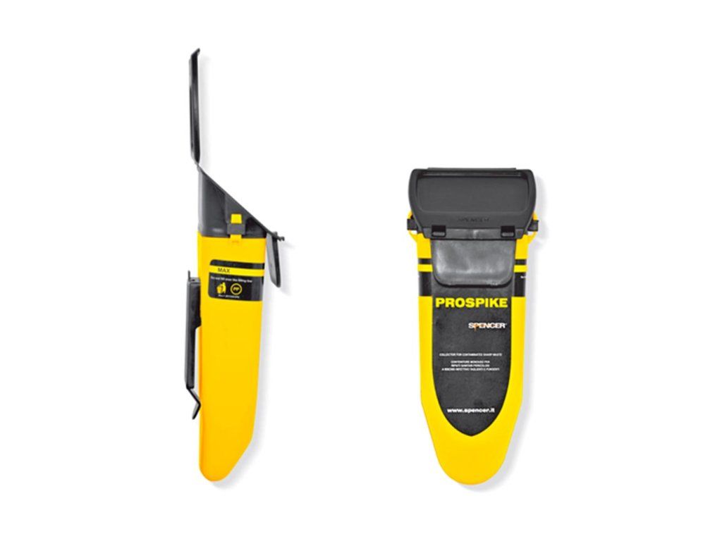 Jednorázový kontejner na bezpečné uložení použitých jehel k injekčním stříkačkám na opasek. Chytré řešení pro bezkontaktní odkládání znečištěného materiálu, bezpečný uzávěr.