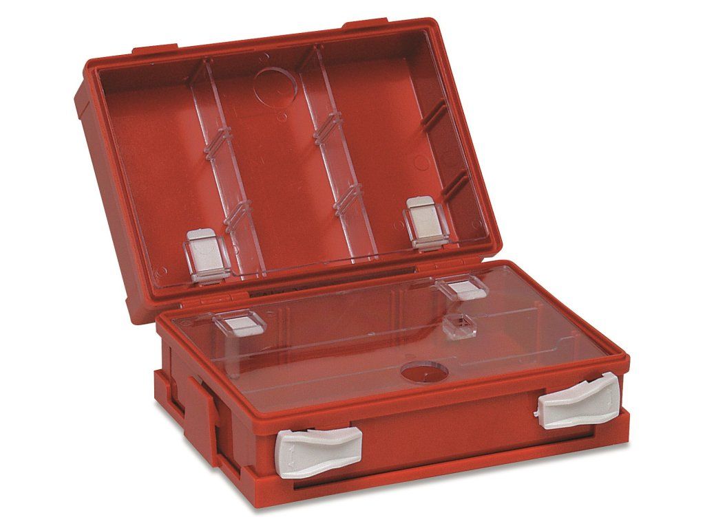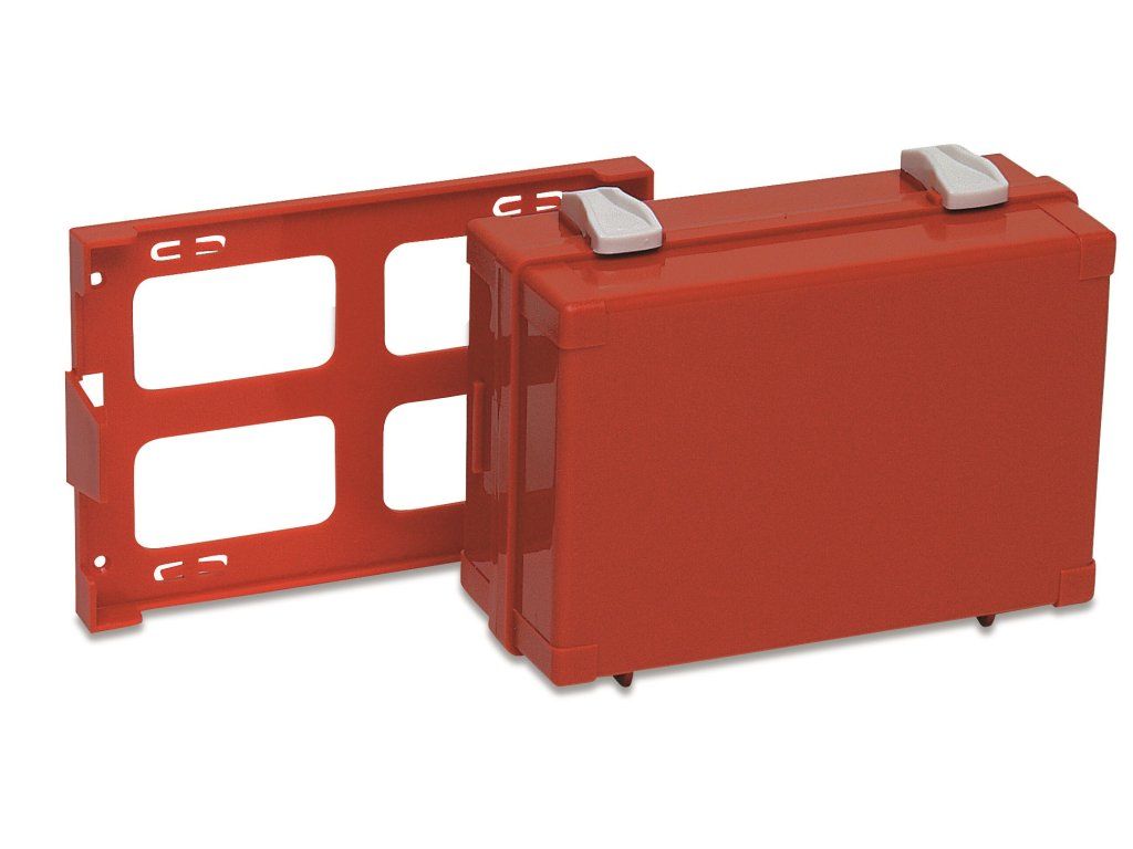 Prázdný plastový kufřík pro první pomoc MINI A2008 s nástěnným držákem. Rozdělený na dvě stejné části s plastovým uzavíracím panelem a přepážkami. Bezpečné uzavírání kufru zaručují dva otočné uzávěry. Velmi nízká vlastní hmotnost kufru 0,45kg.