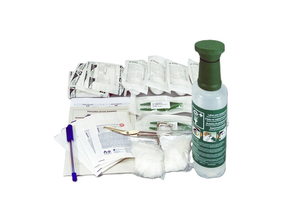 Náplň obsahuje veškerý zdravotnický materiál pro poskytnutí první pomoci při zasažení očí nebezpečnou látkou či podráždění cizím předmětem a jednu láhev s fyziologickým roztokem.