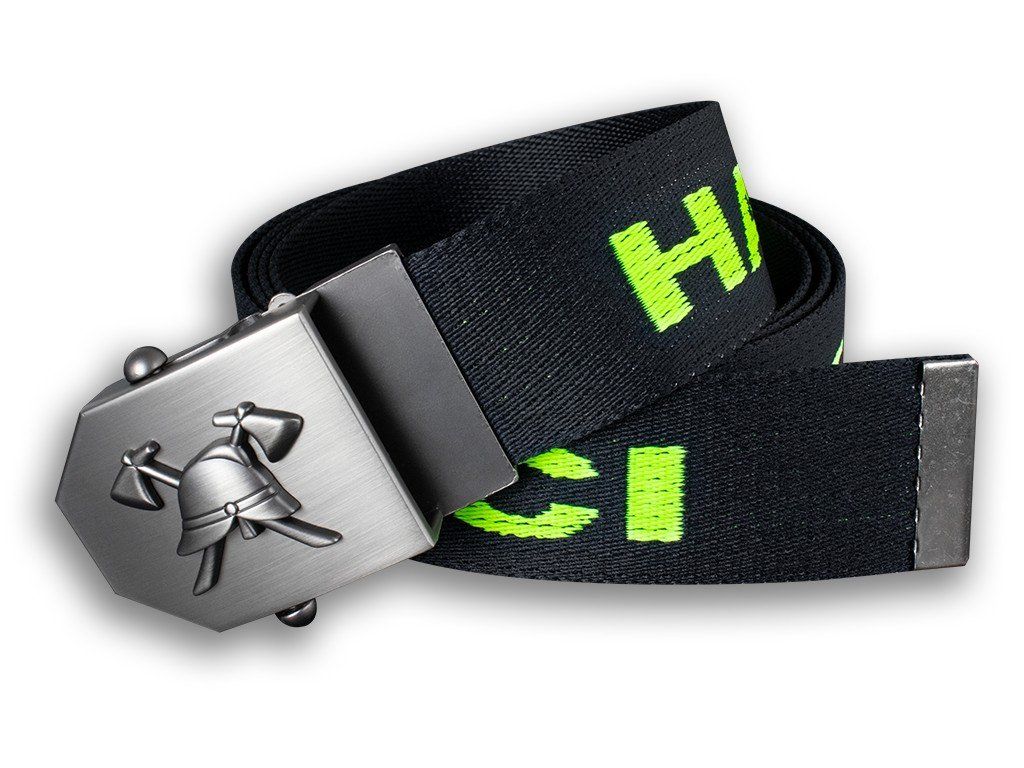 Nová, masivní kovová přezka s ostře řezanými rysy obsahuje 3D hasičský motiv helmy a sekery.